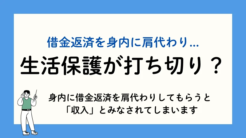 親族が借金の返済を肩代わりすると、その金額が生活保護受給者の「収入」とみなされます。収入が最低生活費を超えてしまうと、生活保護が停止・廃止となる可能性があるため、注意が必要です。